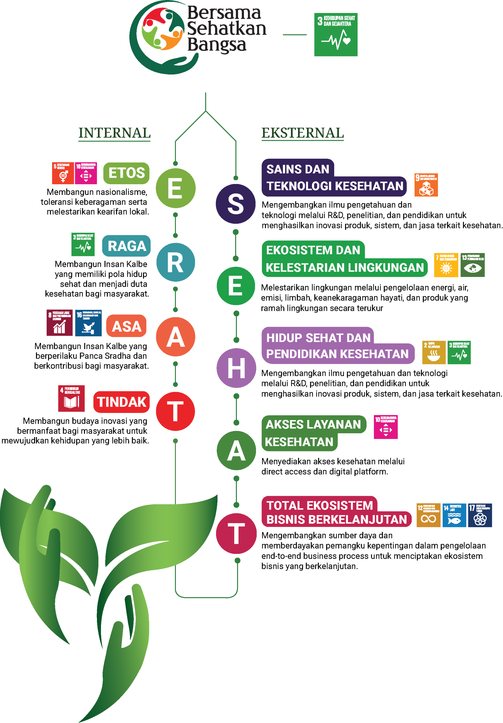 Secara internal, Kalbe mengikuti Pilar ERAT yaitu Ethos, Regnant Body, Aspiring, dan Taking Action, dan secara eksternal Kalbe mengikuti Pilar SEHAT yaitu Science and Technology for Health, Ecosystem & Environmental Preservation, Hygiene & Health Education, Access to Healthcare dan Total Ekosistem Bisnis Berkelanjutan. Pilar-pilar yang menjadi prioritas dukungan Kalbe ini kami petakan pada tujuh Tujuan Pembangunan Berkelanjutan (SDG) nomor 1,3,4,7,9,10, dan 12, dengan dukungan utama pada nomor 3: 'Kesehatan dan Kesejahteraan yang Baik'.